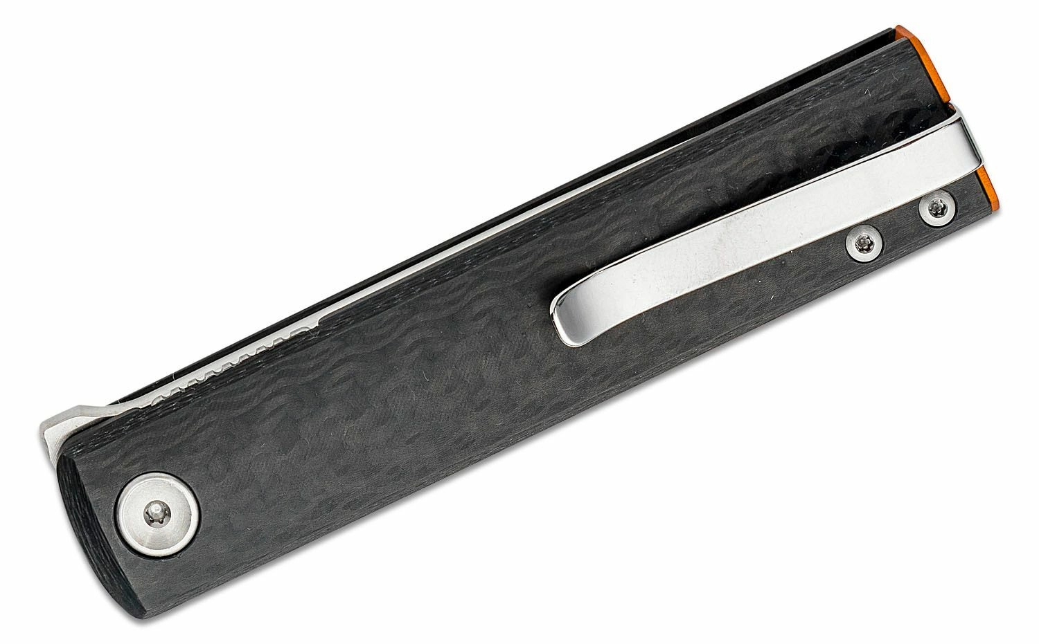 Der Griff aus Carbonfaser mit eloxierter Aluminiumeinlage in Orange verbindet geringes Gewicht, hohe Festigkeit und einen markanten Look. Der integrierte Taschenclip ermöglicht bequemes Tragen und schnellen Zugriff – ideal für Stadt, Touren und kleine Alltagsaufgaben.