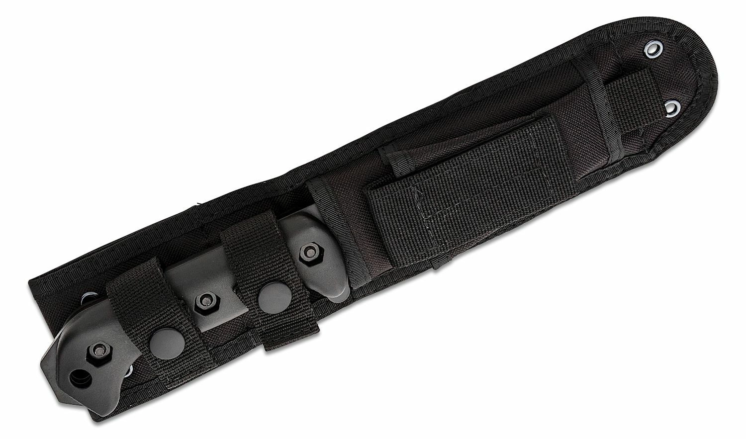Am Griffende befindet sich ein Stahlstift, der zum Einschlagen von Glas, Niederdrücken von Türgriffen oder für Notfall-Schläge dient. Außerdem gibt es eine Öffnung für Paracord oder eine Schlaufe, um das Messer bei der Arbeit zusätzlich zu sichern. Das Messer wird mit einer robusten Scheide aus ballistischem Nylon geliefert, die ein sicheres und bequemes Tragen am Gürtel oder an der Ausrüstung ermöglicht.
