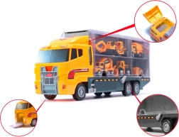 Dieser 2-in-1-Transporter und Spielset verbindet Spaß mit Praktikabilität. Der Sattelschlepper mit transparenten Seiten fasst sechs detailreich gestaltete Baufahrzeuge und dient zugleich als kompakter Organizer. Kinder genießen realistisches Bauspiel dank beweglicher Teile und der cleveren ausfahrbaren Rampe per Knopfdruck.