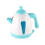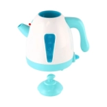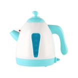 Der Wasserkocher ist wie ein echtes Küchengerät mit elegantem weißen und türkisem Farbdesign gestaltet.