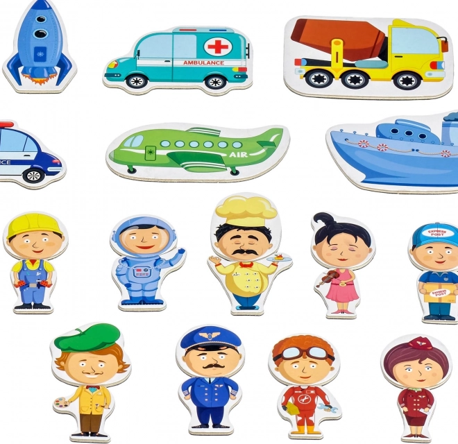 Die umfangreiche Sammlung magnetischer Teile und beidseitiger Karten motiviert Kinder sowohl zum richtigen Zuordnen als auch zu freier Kreativität beim Entdecken verschiedener Berufe.