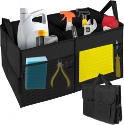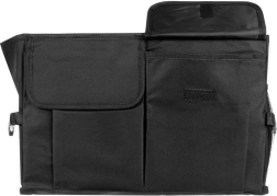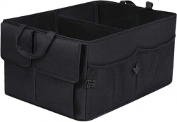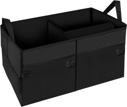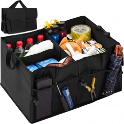 Halten Sie Ordnung im Auto mit dem geräumigen und faltbaren Kofferraum-Organizer aus strapazierfähigem Oxford-Gewebe. Er besitzt verstärkte Seitenwände, 1 großes und 2 kleinere Fächer, Seitentaschen mit Klettverschluss sowie Netztaschen. Dank der Tragegriffe nehmen Sie ihn leicht aus dem Auto heraus, die verstellbare Länge von 26–52 cm spart Platz.