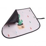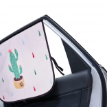 Praktischer und sicherer Schutz für Reisen mit Kindern und Erwachsenen. Der doppellagige Polyesterstoff mit Kaktusdruck sorgt für vollständige Verdunkelung, dämpft blendende Sonne und verhindert die Überhitzung des Fahrzeugs. Auf der Rückseite befindet sich der Schriftzug „Go out and enjoy the sunshine“ auf schwarzem Hintergrund.