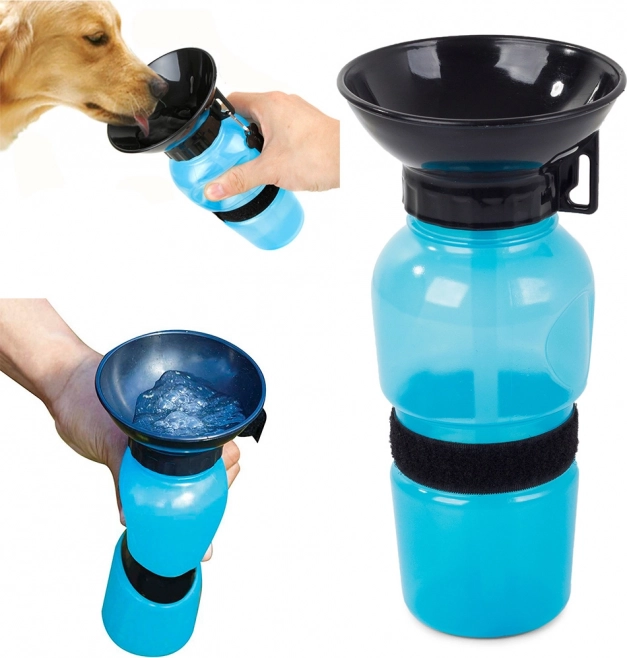 Praktische Reisewasserflasche für Hunde mit integrierter Schale für komfortables Tränken unterwegs. Einfach die Flasche drücken und das Wasser läuft in die Schale. Dank des auslaufsicheren Verschlusses läuft im Rucksack nichts aus und mit dem befestigten Griff sowie dem Klettband lässt sie sich leicht am Gürtel oder Rucksack anbringen. Ideal für Spaziergänge, Wanderungen und Reisen bei Hitze.