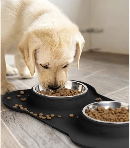 The bone-shaped mat stays firmly in place and prevents the bowls from moving during feeding.