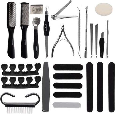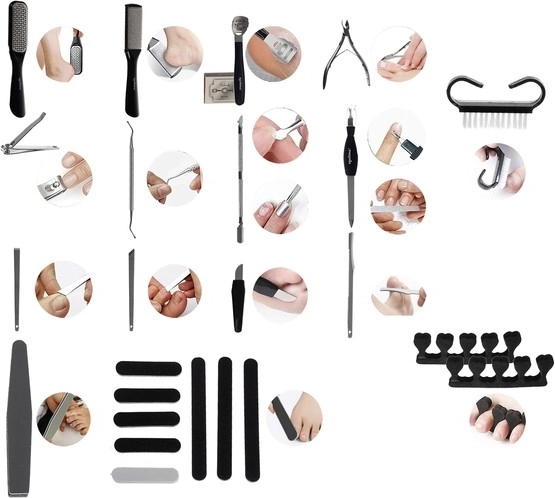 • 26 pieces: files, buffers, scissors, clippers, callus shaver, spare blades, scrapers, probes, separators, brush, and more.