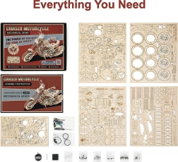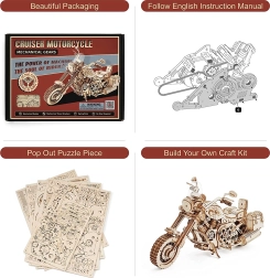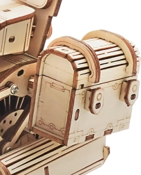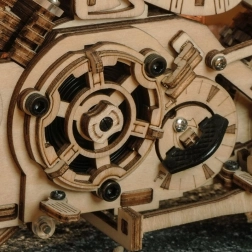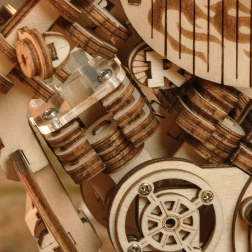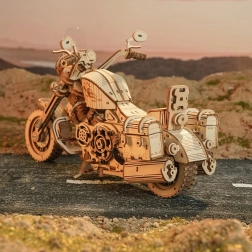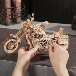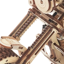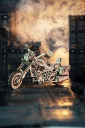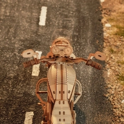 This wooden mechanical motorcycle is a great choice for anyone who loves design, engineering, and hands-on craftsmanship. The wind-up spring mechanism with trigger sets the model in motion for a brisk ride, while functional handlebars allow partial steering control. The realistic engine action is beautifully complemented by piston movement and the working suspension of the front fork.