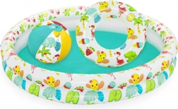 The set includes an inflatable pool, a swim ring, and a beach ball—perfectly matched in a playful tropical design. Kids get everything they need at once for safe water play.