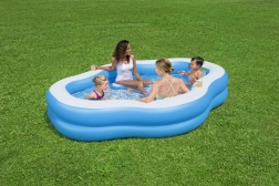 Enjoy summer with the spacious BESTWAY family pool featuring integrated inflatable seats, cup holders, and a clear viewing window for extra fun and comfort. Durable vinyl, a stable structure, and easy inflation/deflation make it an ideal backyard pool for kids and adults alike.