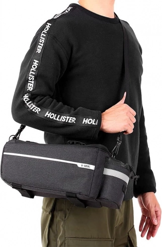 Installation is quick and reliable thanks to adjustable hook-and-loop straps that fit most racks. The pannier features reinforced sides for better load stability and a waterproof surface that protects contents from rain and dirt. It comes with a detachable shoulder strap and a top handle so you can easily carry it off the bike.