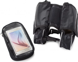 - Consists of a double pocket for the phone and two mesh pockets.