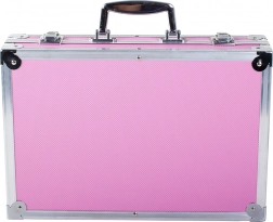 A pink case with metal corners provides robust protection and easy portability thanks to the handle.