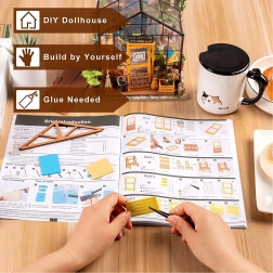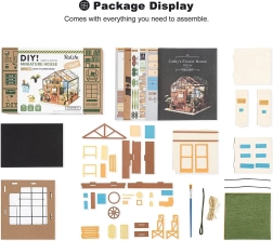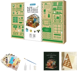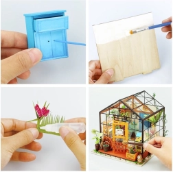 Miniature Greenhouse by ROBOTIME is a detailed artistic construction kit that lets you enjoy pleasant creative moments and make a cozy decoration with LED lighting. The box includes everything you need to assemble it – glue, paints, brush, and small tools. The model stands out with rich details, a realistic look, and a relaxing building experience.