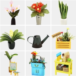 Discover the charm of miniatures with the Robotime Mini Greenhouse model. Inside the box you’ll find pre-cut plywood parts, paper prints, fabric and metal elements that, once painted and glued, create an impressive little greenhouse full of plants and garden accessories. LED lighting gives the finished model a warm and cozy atmosphere.