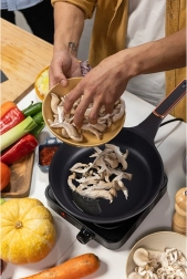 Discover a helper that makes cooking faster, healthier, and more comfortable. The die-cast aluminum pan conducts heat excellently, so ingredients brown evenly without scorching. The high-quality non-stick surface minimizes the need for oil and speeds up cleaning.