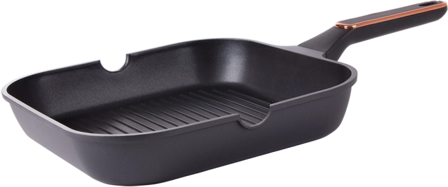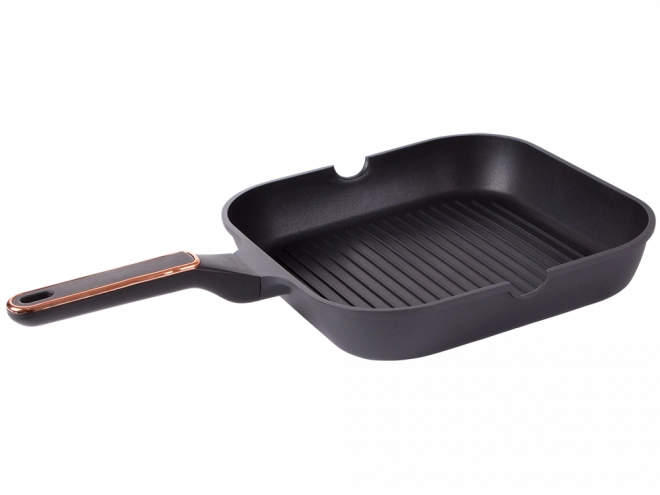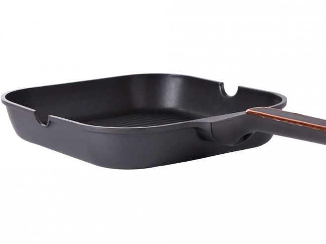 Durable 28 cm grill pan made of die-cast aluminum with a non-stick coating for easy cooking and cleaning. Suitable for induction, gas, ceramic glass, and electric cooktops. The ribbed surface creates a grill effect, dual-sided pour spouts make draining easier, and the ergonomic handle ensures a secure grip.
