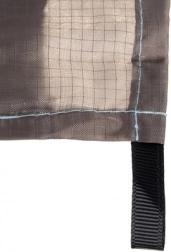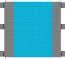 Fill the six pockets with sand and anchor the corner eyelets with the included pegs — the mat will stay firmly in place even in gusts of wind.