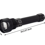 Powerful BAILONG tactical flashlight with a CREE XHP70 LED for reliable illumination outdoors and at home. It offers a beam distance of up to 1000 m, smooth zoom, 3 light modes, a robust aircraft‑grade aluminum body with IPX5 protection, USB charging, power from 2× 26650 cells, and a LED charge indicator.