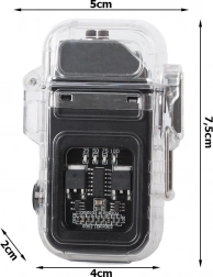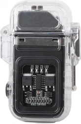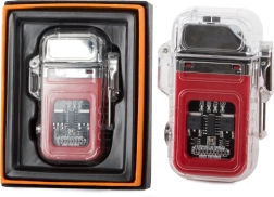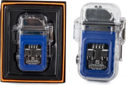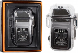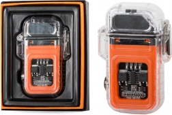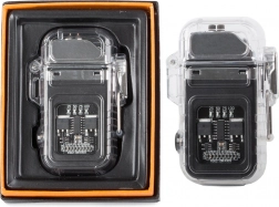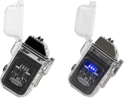 The rugged body with sealing, a rubber button, and a latch closure with clip increases resistance to moisture and impacts. The lighter charges easily via micro USB (cable included) and four blue LEDs clearly show the charge level (100/75/50/25%). An elegant gift box is included, making it great as a present.