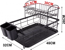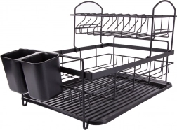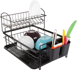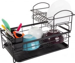 Efficiently organize your kitchen with this two-tier dish rack. The rack is made of durable metal and equipped with a practical plastic drip tray that prevents water from spilling onto the countertop.