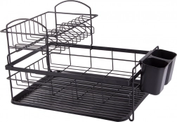 The dish rack’s two-tier construction maximizes drying space. The upper level holds up to 11 plates, while the lower section provides plenty of room for cups and bowls. It also comes with a removable cutlery holder that can be moved to suit your needs.