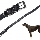 A stylish and durable eco-leather collar with silver studs for medium and large dogs. Thanks to the buckle it is fully adjustable, features sturdy metal hardware and a ring for attaching a leash. The comfortable design prevents chafing and is ideal for everyday walks as well as special occasions.