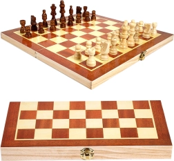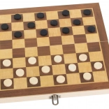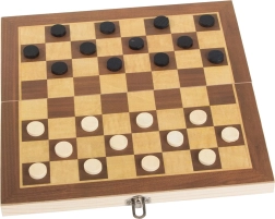 Play beloved checkers on a double-sided wooden board that you can easily fold and secure after the game.