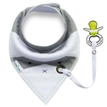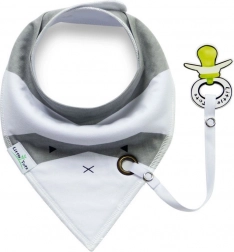 Practical baby bandana/bib with a removable pacifier holder in a universal white–gray color. Offers a soft cotton material gentle on skin, snap-adjustable circumference, and serves as a stylish neck warmer and functional bib for the teething period.