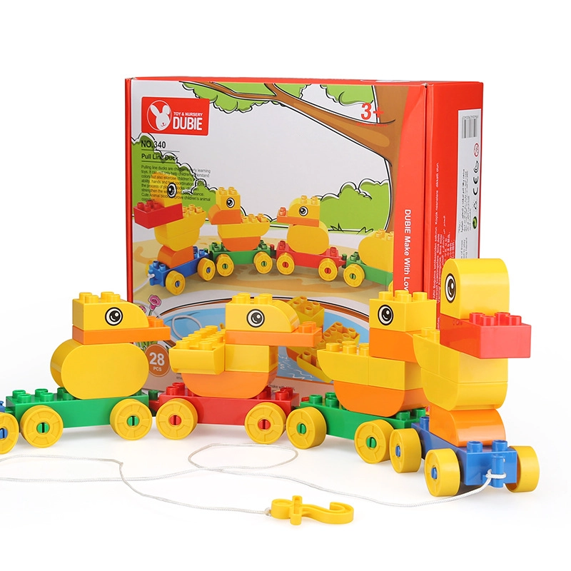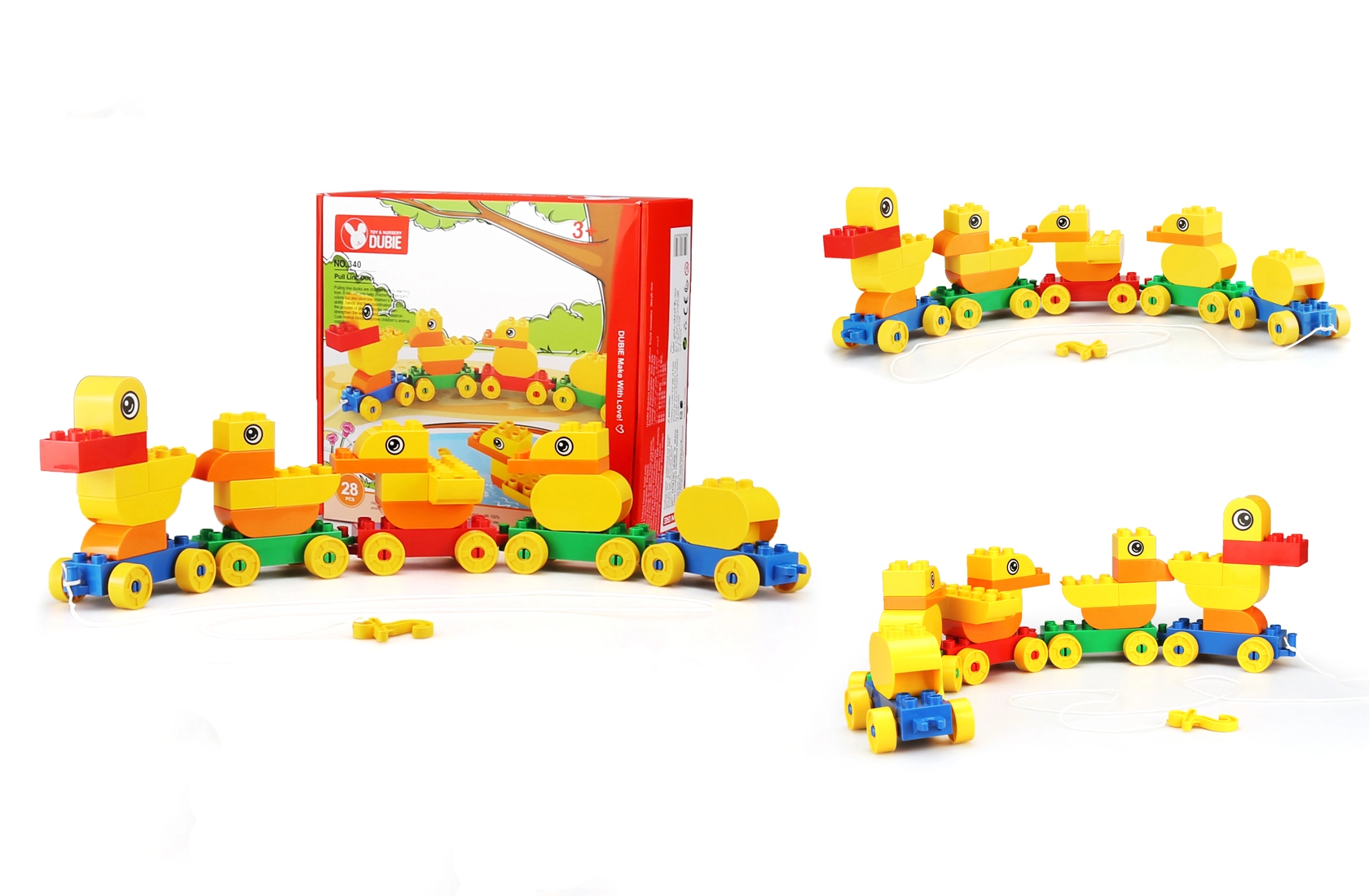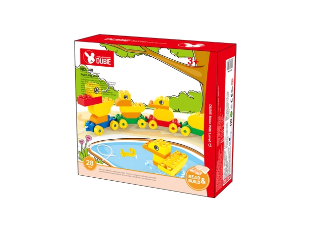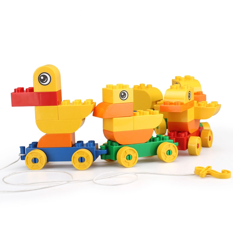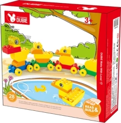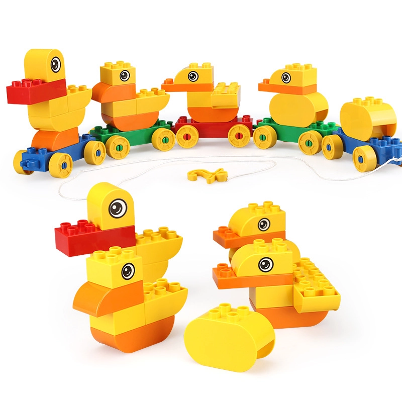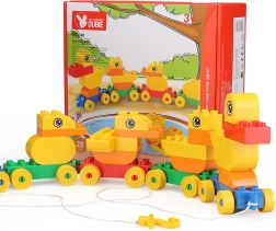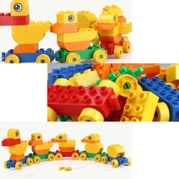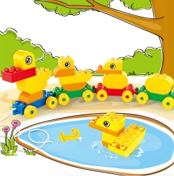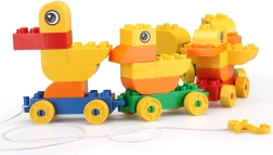 Assemble a duck family from the blocks and easily connect them into a rolling train using the wheeled bases.