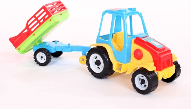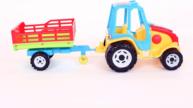 A children's tractor with a trailer offers fun play indoors and outdoors. The trailer is single-axle, swivels, and tilts backward for easy unloading. The toy is made from safe materials free of heavy metals and meets all safety requirements. Toy dimensions: length 48 cm, width 15 cm, height 17.5 cm.