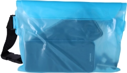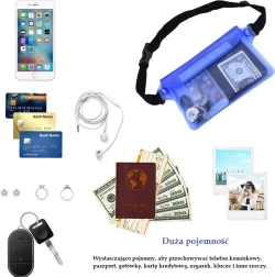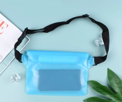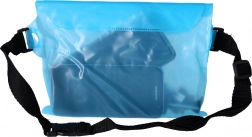 A practical and stylish waterproof waist bag in light blue protects your phone, documents, keys, and cash from water and sand. Thanks to the transparent material, it allows touchscreen control, features an adjustable strap, and secure hook-and-loop (Velcro) closure. Ideal for the beach, pool, and water sports.