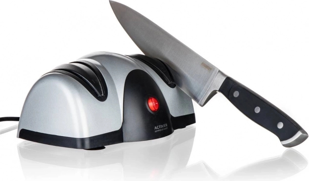 Keep your kitchen knives in top condition with the ACTIVER electric sharpener. It offers four guide slots for different knife shapes, two grinding wheels for coarse and fine sharpening, and a non-slip base for safe operation. The combination of tungsten and ceramic stones ensures a sharp, smooth edge for precise cutting.