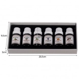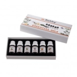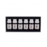 The set includes six different scents like eucalyptus, orange, tea tree, mint, lavender, and pine. Each oil is carefully sealed in a 10 ml bottle.