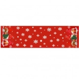Red background with white snowflakes and stars, with gnome decorations holding gifts at the ends – a perfect addition to your Christmas table.