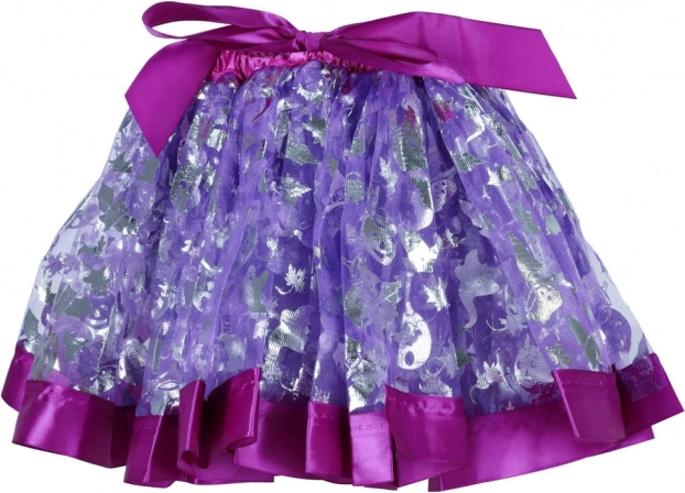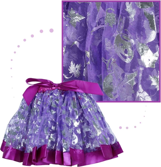 The purple skirt with shiny silver patterns and an elastic waistband easily adapts to different body types.
