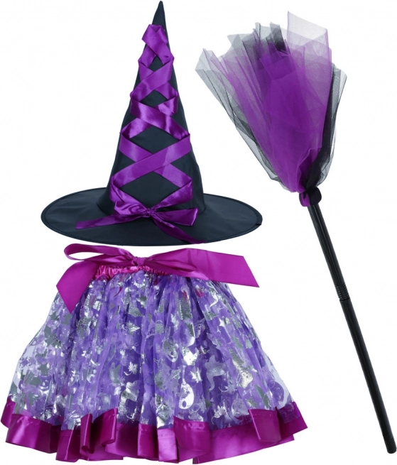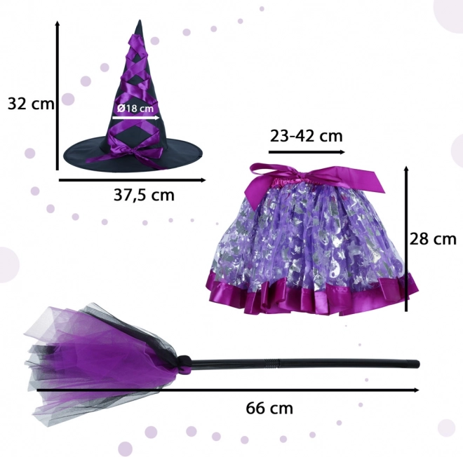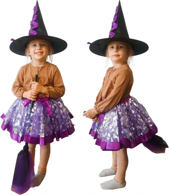 Dress your child in this enchanting witch costume set, which includes a decorative hat, a purple skirt with an elastic waistband, and a unique broom. This costume is perfect for school carnivals, themed events, or just at home for everyday fun.