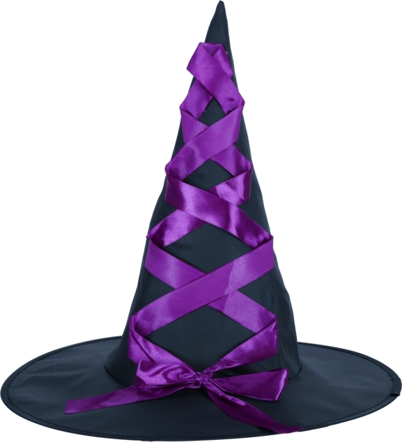 The black and purple hat with a distinctive crossed purple ribbon adds authenticity to the costume.