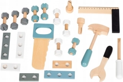 Up to 32 wooden pieces — tools, screws, nuts, and connectors — for endless building and learning through play.