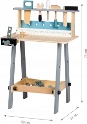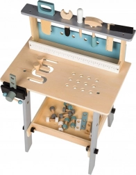 It also includes a practical vise, a worktop with holes and a ruler, and a shelf for storing tools. Natural wood combined with muted colors looks stylish in any kids’ room and supports creative and pretend play.