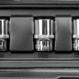 The practical case keeps everything in place. The set includes the three most commonly used sockets 17/19/21 mm and an extension for easy access.