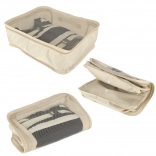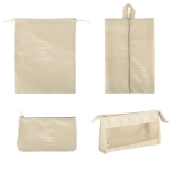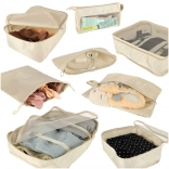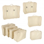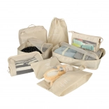 Get your luggage organized once and for all. This 8-piece set of travel organizers in elegant beige includes four clothing cubes, a shoe bag, a cosmetic pouch, a drawstring bag, and a small pocket for accessories. Thanks to the lightweight, durable polyester fabric, the organizers are easy to clean, resistant to dirt, and perfect for clear, organized packing for trips and everyday use.