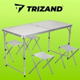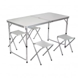 A lightweight and compact camping set with a folding table and four stools, ideal for trips, picnics, and the garden. The table features three-level height adjustment, quick setup in under 1 minute, and a practical suitcase-style design for easy transport. The durable construction supports up to 40 kg on the table and 90 kg on each stool.