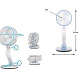 A compact and portable desktop fan with an integrated LED light brings refreshment at home, in the office, and on the go. Thanks to USB charging and a built-in battery, it offers true cord-free freedom. Enjoy quiet operation, stepless speed control, and an adjustable tilt for targeted airflow, complemented by 8 LEDs for practical illumination.