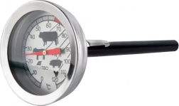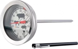 The thermometer features symbols for optimal temperatures of different types of meat and a readable dial.