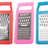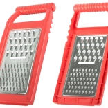 It includes three blade types: slicing, coarse grating, and fine grating. Thanks to the hooks for resting on a bowl or pot, you get stability and free hands while working. The grater is ideal for vegetables, fruit, and cheese, and it rinses clean easily after use.