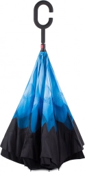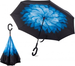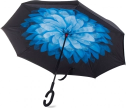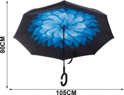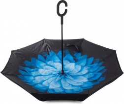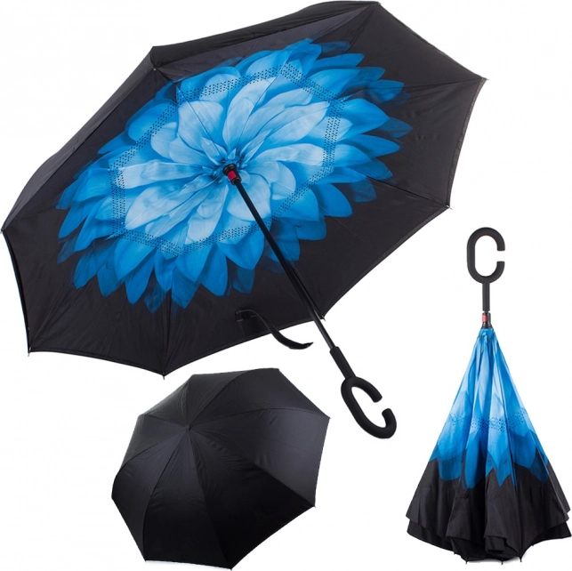 A practical inverted umbrella with a C handle featuring a drip-free design, double-layer fabric, and sturdy hidden ribs for increased wind resistance. The exterior is black, while the interior showcases a stylish blue flower that brightens rainy days.