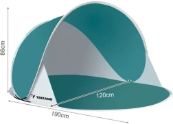Enjoy comfort and shade by the water with the TRIZAND beach tent. The semi-open POP-UP design unfolds almost instantly when removed from the cover, and flexible fiberglass poles ensure stability. The tent reliably protects against wind and sun; the fabric with a UV filter UPF 30+ reduces harmful radiation. A water column rating of 300 mm provides protection against light rain or drizzle.