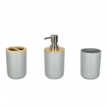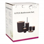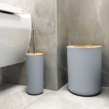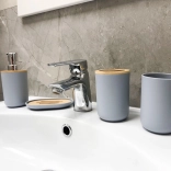 A stylish 6-piece bathroom set in elegant gray with natural wooden accents unifies the look of your bathroom and provides everything needed for daily hygiene. Includes a soap dispenser, tumbler, toothbrush holder, soap dish, toilet brush with holder, and waste bin. Durable plastic construction and easy maintenance ensure a long service life and a modern minimalist look.