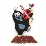 Creative design of Little Mole with a red violin, standing on a brown hill.