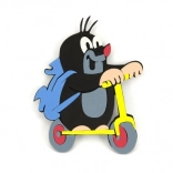 A colorful foam decoration of Little Mole on a yellow scooter that will delight every child.